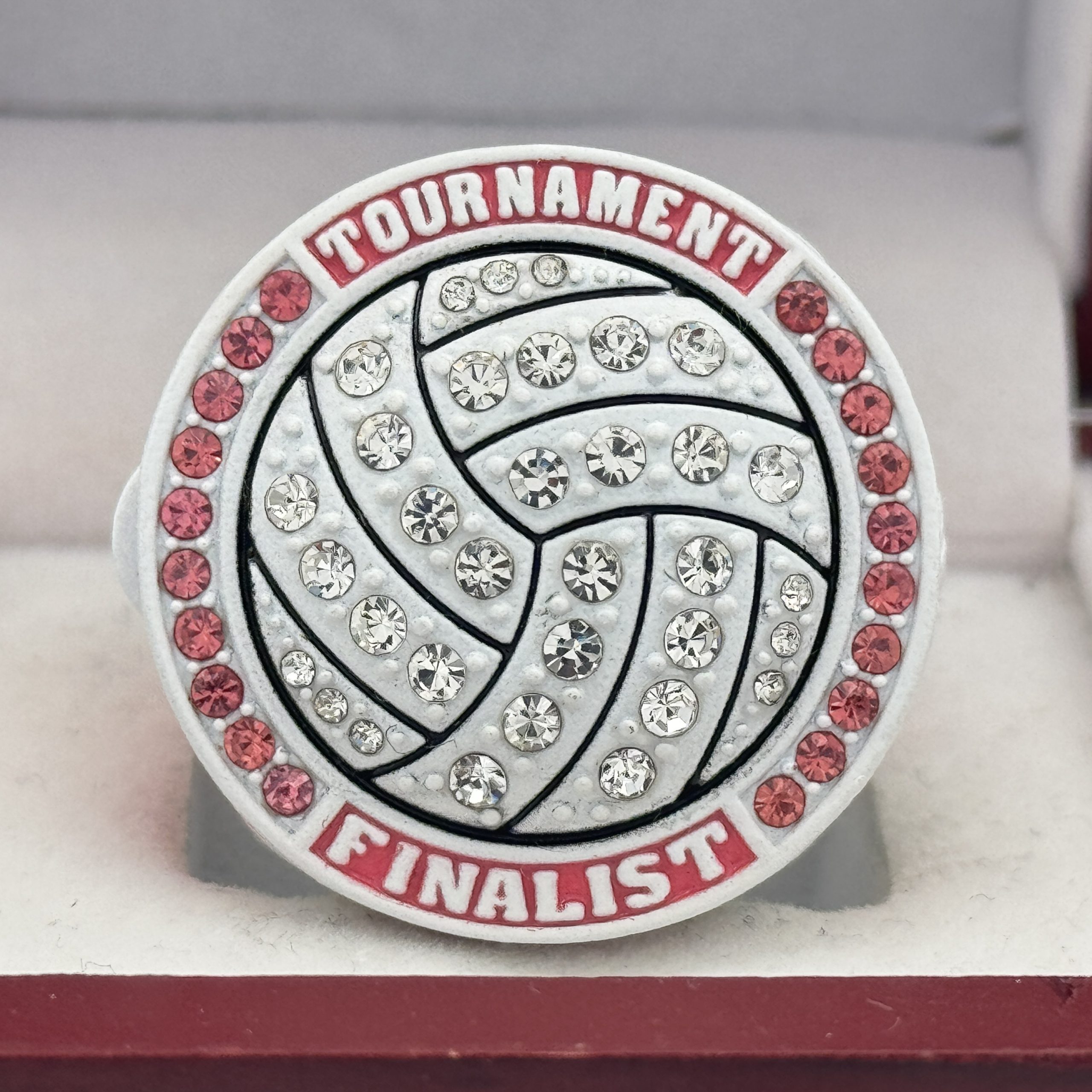 This ring is made of a zinc alloy. The ring body is white in color. The stones in the side bezel are pink and the stones in the top bezel are pink in color. The right side of the ring shows a trophy cup and the left side shows a volleyball in front of the net. The top of the ring shows a volleyball with clear stones and says tournament finalist.